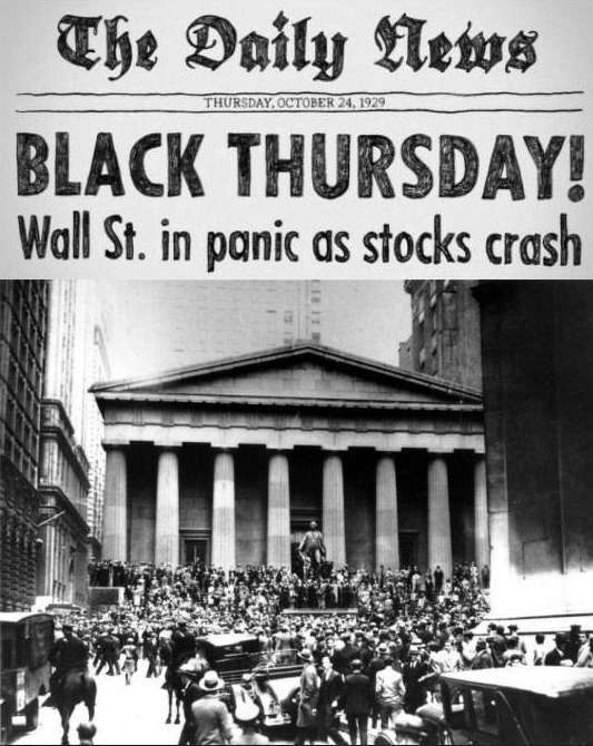 Sept semaines plus tard, le 24 octobre 1929 – connu depuis lors sous la formule choc de «jeudi noir» – le cours des actions à Wall Street a plongé. À midi, l’indice Dow Jones a perdu 22,6 %. Une émeute éclate à l’extérieur du New York Stock Exchange, après que les gardes du bâtiment et la police ont empêché des actionnaires d’entrer. La galerie des visiteurs est fermée. Les rumeurs les plus folles circulent: onze spéculateurs se seraient suicidés, les bourses de Chicago et Buffalo auraient déjà fermé, celle de New York serait sur le point de le faire. Les banques décident d’intervenir et les cours se redressent. Finalement, la baisse pour la journée va être limitée à 2,1%. Les cours restent stables le vendredi 25 et samedi 26 (avant-guerre, il y avait une demi-session le samedi).