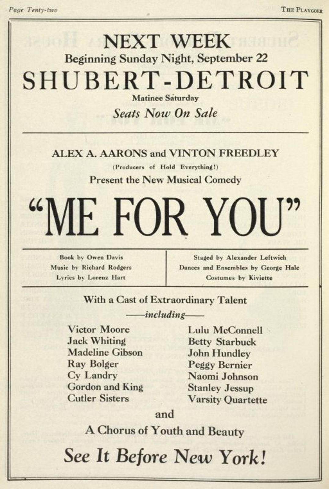 Malgré cela, Aarons et Freedley ont suffisamment apprécié le travail de Rodgers et Hart pour signer avec eu pour un nouveau musical qui s’appellerait Me for You et dont le livret serait également d’Owen Davis, comme celui de Spring is here ().