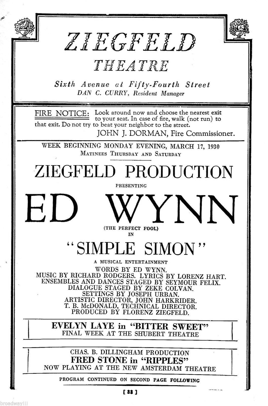 Ziegfeld a programmé Simple Simon () pour suivre Bitter Sweet dans son somptueux Ziegfeld Theatre où il a ouvert le 18 février 1930. Les critiques aimaient tous Ed Wynn, mais étaient cinglants dans leur évaluation du livret: «ennuyeux», «compliqué», «banal», «sans humour» et «sinistre» sont quelques-uns des termes utilisés. Simple Simon () a tenu l’affiche 135 représentations. Une déception de plus. Mais surtout, une fois encore, Rodgers et Hart sont très loin de leurs rêves de l’époque Chee-Chee () de développer des «musicals différents» ().