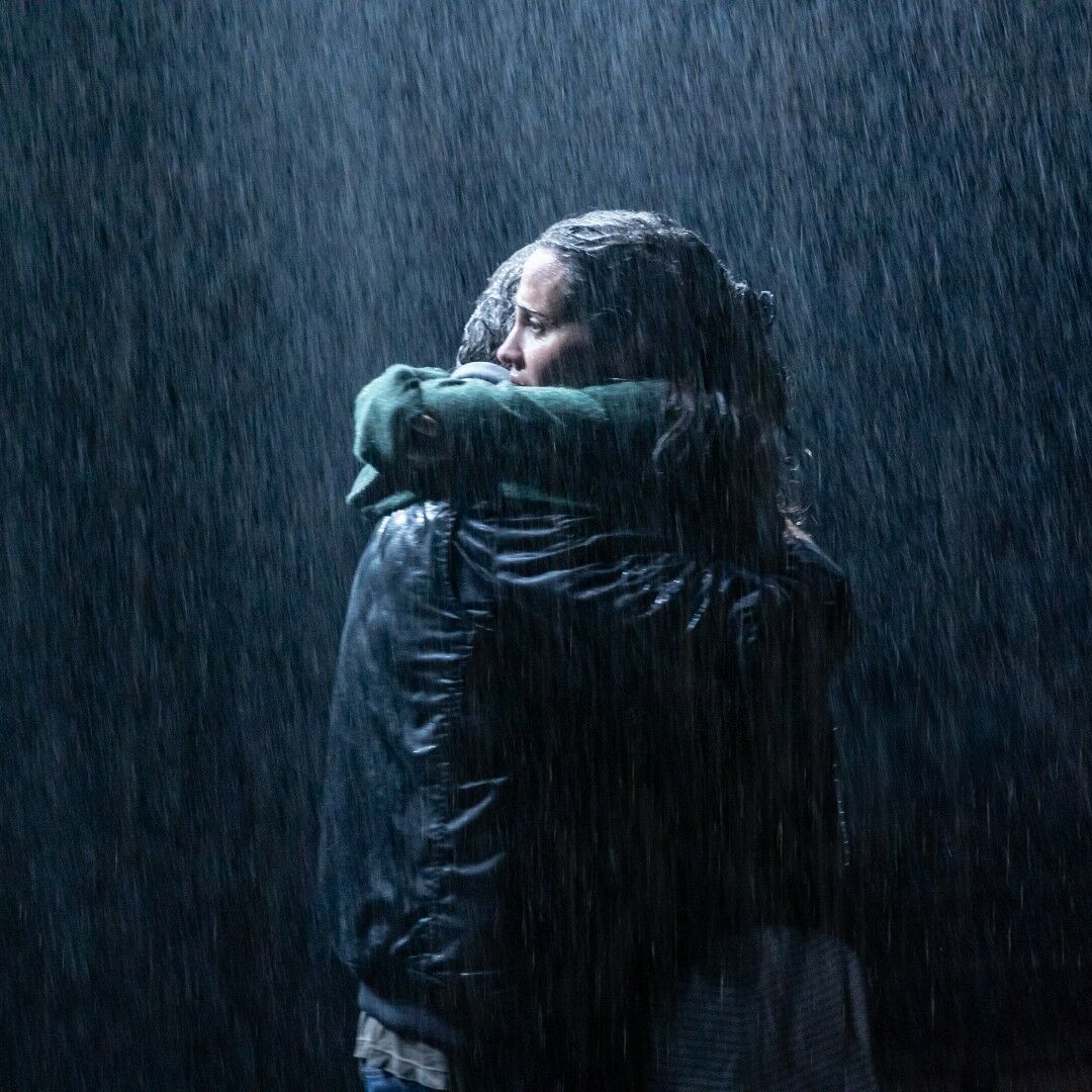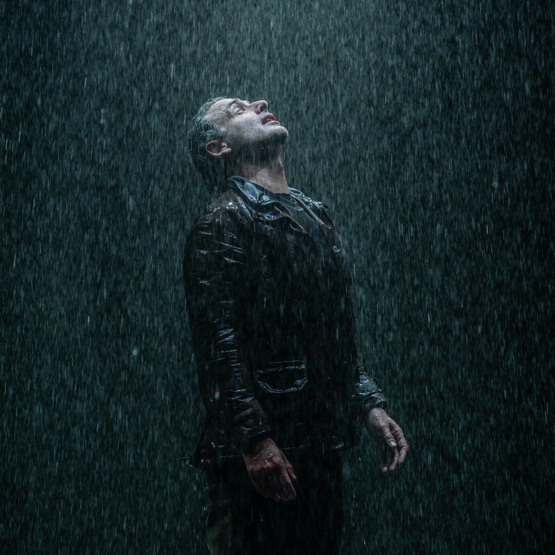 La transition vers la deuxième partie de la pièce est un changement radical avec le décor qui devient entièrement noir, et cette pluie torrentielle qui s’abat sur la scène. S’abattre est vraiment le bon terme. En tant que spectateur c’est physiquement très intense, même s’il ne nous pleut pas dessus. Le passage du blanc au noir symbolise l’émergence des secrets enfouis et des émotions refoulées. Mais la pluie nous fait ressentir la tempête émotionnelle que vit Ellida. La pluie est une manifestation physique explosive du tumulte et du désordre psychologiques qu’elle a longtemps essayé de contenir.