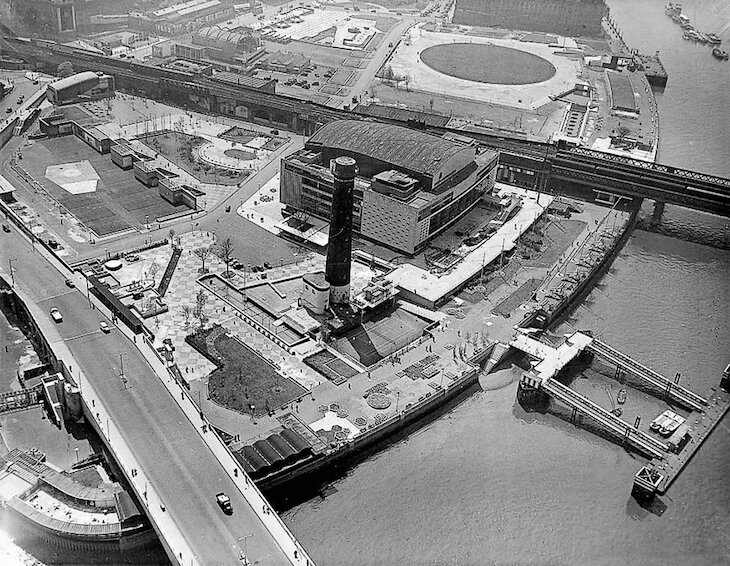 Pourquoi le South Bank? À l’époque, la rive sud était un secteur industriel un peu décrépit, plein d’entrepôts, de voies ferrées et de terrains vagues. Pas franchement glamour. Mais c’était central, et face à Westminster (comme le montre la photo de droite ci-dessus): le lieu parfait pour symboliser la renaissance du pays, littéralement « de l’autre côté du fleuve ».
