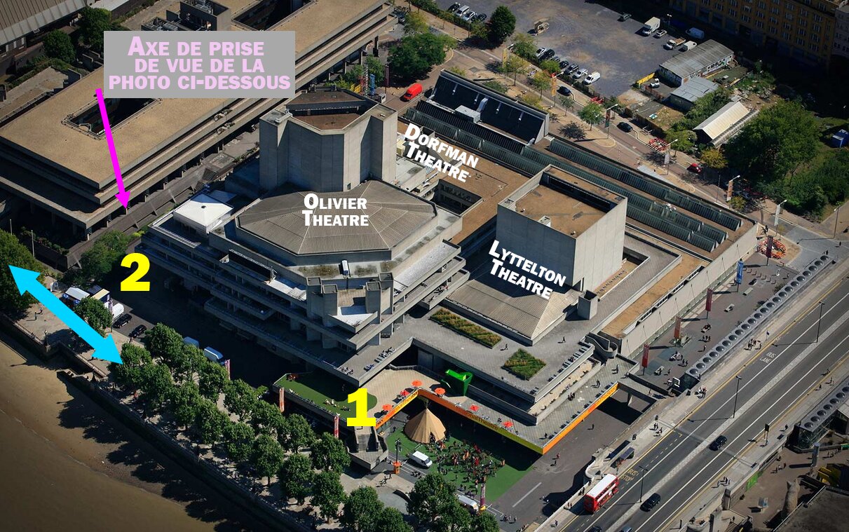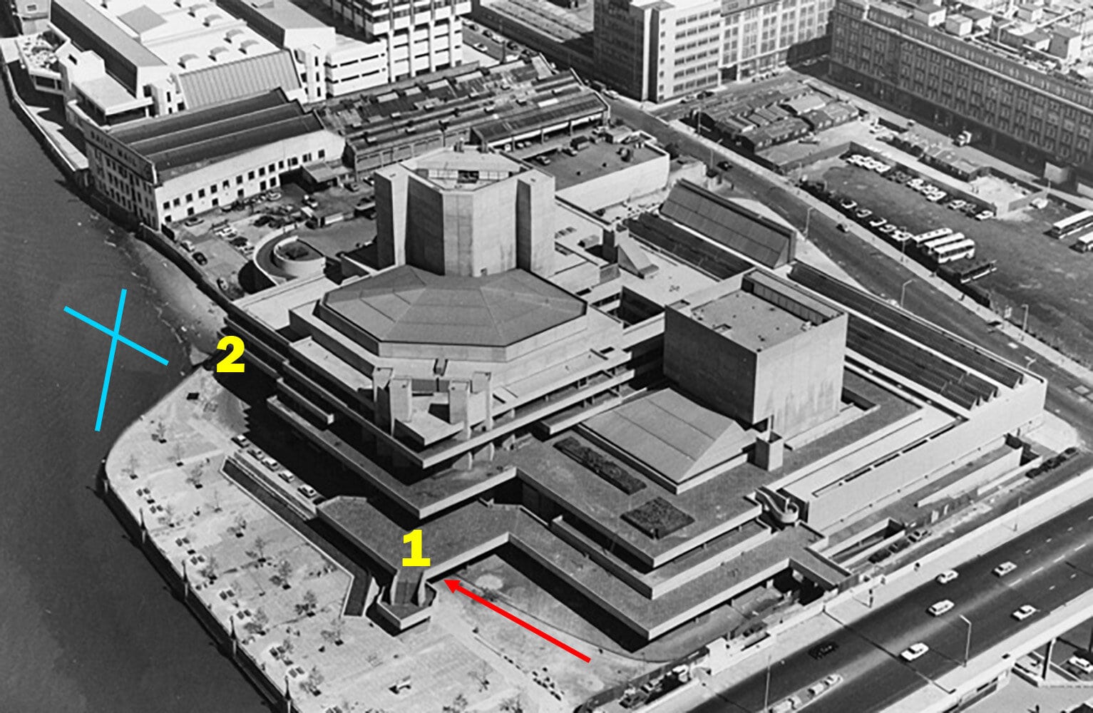 On remarque que le théâtre est encore à l’époque accessible en voiture (flèche rouge). L’entrée se trouve alors uniquement en ➀ (comme aujourd’hui) mais le ➁, à l’époque n’est qu’un coin de bâtiment en bord de tamise. On ne peut d’ailleurs pas continuer au-delà. Aujourd’hui, après les transformations récentes NT Future, ce point ➁ est un vrai pôle d’attraction avec une seconde entrée, le bar The Grind et son énorme terrasse. On peut aussi partir à pied le long de la Tamise (flèches bleues).