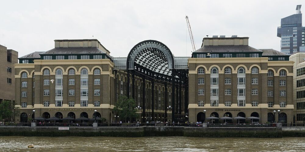Le bâtiment date de 1870. Il abritait la filiale londonienne de la Menier Chocolate Company, entreprise française fondée à Noisiel (près de Paris). L’usine de Southwark, sur Southwark Street, produisait du chocolat et abritait des entrepôts, des bureaux et des logements ouvriers. C’était l’un de ces magnifiques édifices industriels de brique jaune et rouge typiques du XIXème siècle, à la fois fonctionnels et élégants. Après la fermeture de l’usine dans les années 1960, le bâtiment tomba lentement en désuétude – comme tant d’autres entrepôts du secteur. Dans les années 1980, il faisait partie du paysage « fantôme » de Bankside, avant sa renaissance.