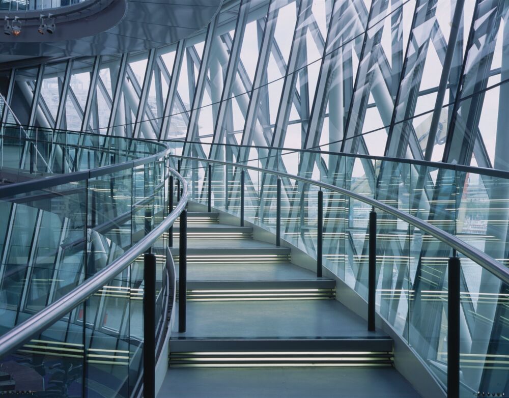 C’est l’élément le plus emblématique du bâtiment. Un immense escalier hélicoïdal s’enroule autour d’un vide central sur plus de 500 mètres de long, reliant tous les étages du sol au sommet. Il n’y a ni ascenseur visible ni cloisonnement hiérarchique: tout le monde (employés, visiteurs, élus, maire) circule dans le même espace fluide. Foster l’a conçu comme une métaphore: «La démocratie doit être un chemin continu, pas une tour fermée.» Depuis la rampe, on voit littéralement le travail des autres – symbolisant la transparence du pouvoir public.