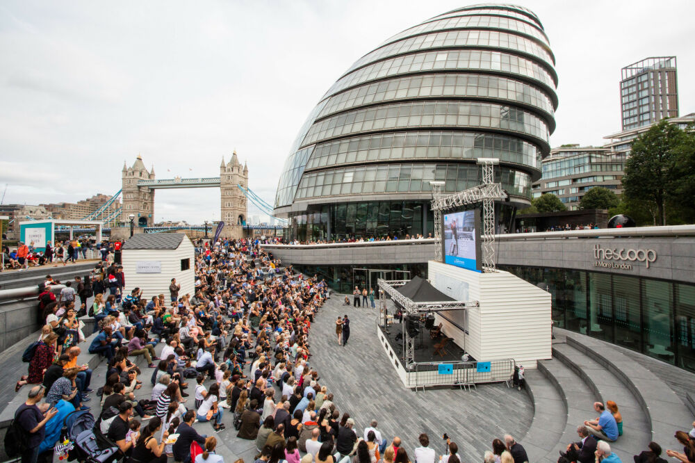 Juste devant City Hall, Foster conçoit et aménage un amphithéâtre extérieur de 800 places environ. Le nom The Scoop (« la cuillère », ou « l’écope ») vient de sa forme creusée dans le sol: trois niveaux concentriques en béton clair, descente fluide vers une scène plate au ras du fleuve. Conçu comme prolongement civique du City Hall : une agora publique, ouverte 24/24.