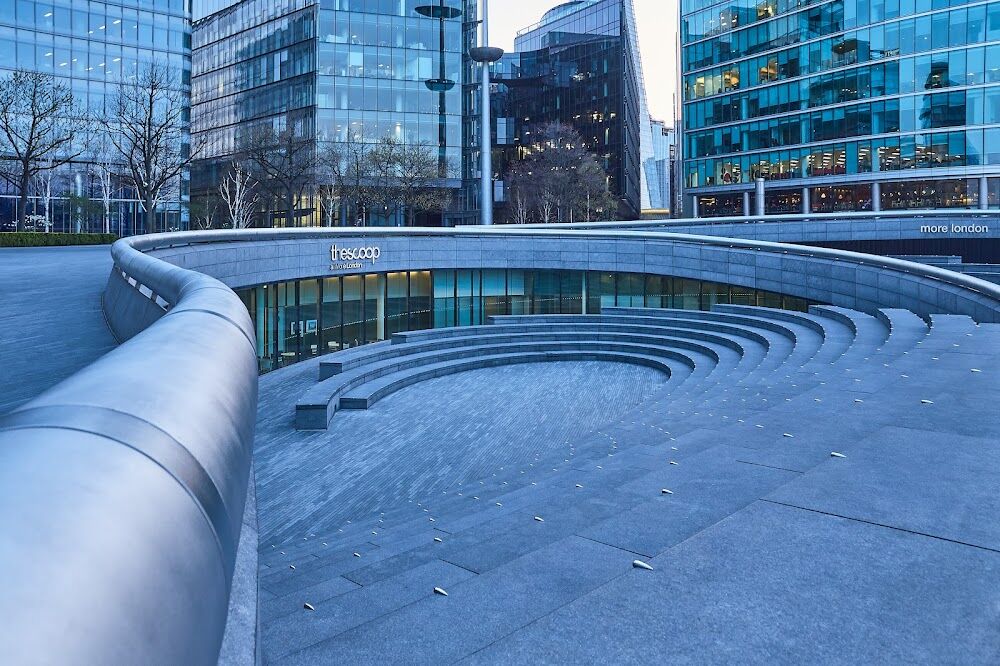 Le City Hall et The Scoop (voir plus bas), construits côte à côte, forment le cœur symbolique du futur nouveau « More London » au tournant des années 2000. C’est là que l’utopie culturelle et urbaine devient réalité: un espace où architecture, politique et citoyenneté se rencontrent sur la rive sud de la Tamise.