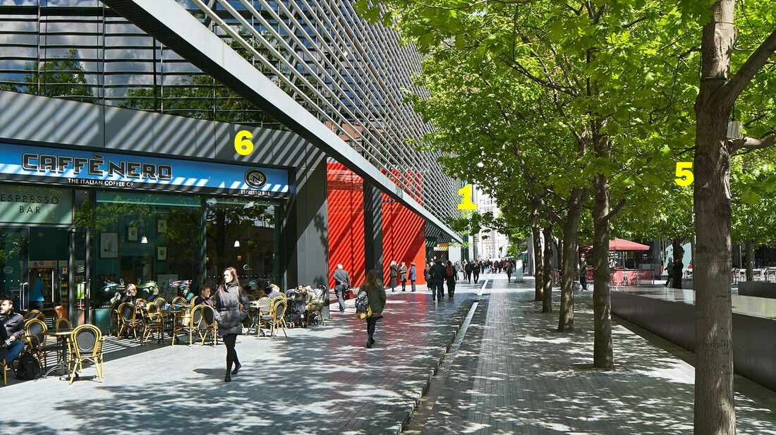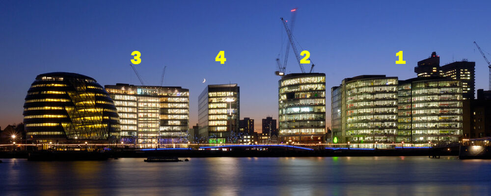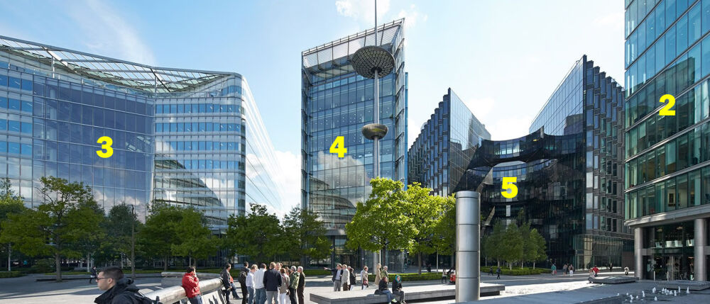 Tout un ensemble de building de verre sont construits. Le « 1 More London Place », le « 2 More London Riverside », le « 2 More London Riverside », le « 3 More London Riverside », le « 4 More London Riverside », le « 5 More London Place », le « 6 More London Place » et le « 7 More London Riverside ». Ils ont été baptisés numériquement suivant leur ordre de construction. On les retrouve ci-dessous avec les numéros en jaune.