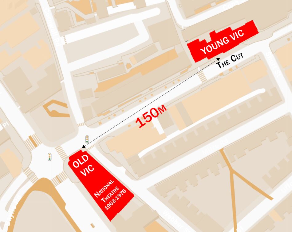 Le théâtre s’installa sur The Cut, juste en contrebas à 150m de l’Old Vic, sur un terrain dévasté par les bombardements de la Seconde Guerre mondiale: 54 personnes y avaient péri alors qu’elles s’étaient réfugiées dans une boulangerie. Le bâtiment, signé Bill Howell, fut construit pour 60.000£, avec une durée de vie prévue de cinq ans seulement – un simple abri temporaire destiné à servir une aventure artistique éphémère.
