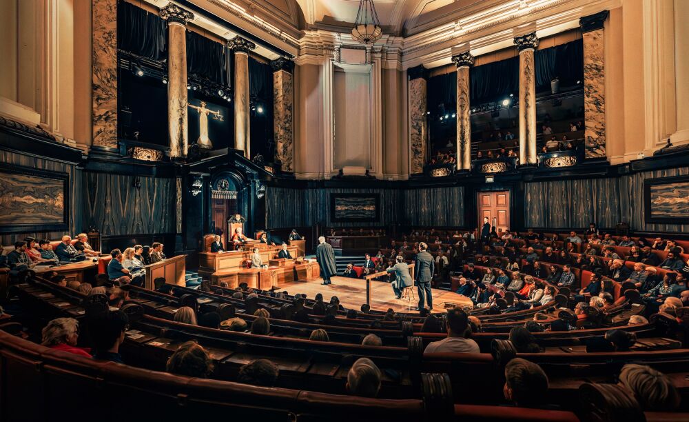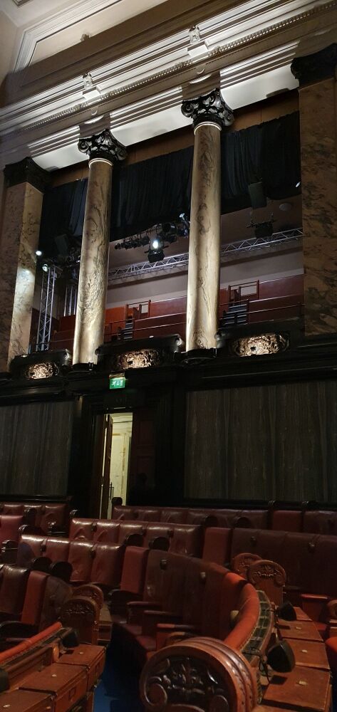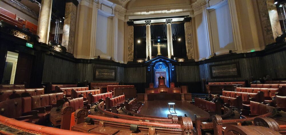 C’était pour le spectacle Witness for the Prosecution (Témoin à charge) d’Agatha Christie qui s’y est joue depuis 2017, mis en scène par Lucy Bailey. Le public est installé dans l’ancienne salle du conseil, transformée en tribunal grandeur nature, ce qui rend l’expérience particulièrement réaliste: jurés (spectateurs volontaires), témoins, accusé – tout y est. Un exemple de plus de réutilisation de bâtiment…