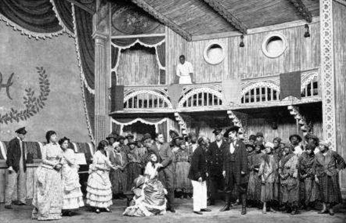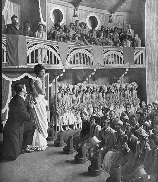La salle du Showboat «The Cotton Blossom» du Captain Andy. Sur scène Howett Worster (Ravenal) and Edith Day (Magnolia). Dans la salle: les blancs au parterre et les noirs au balcon. (Theatre Royal Drury Lane – 1928)