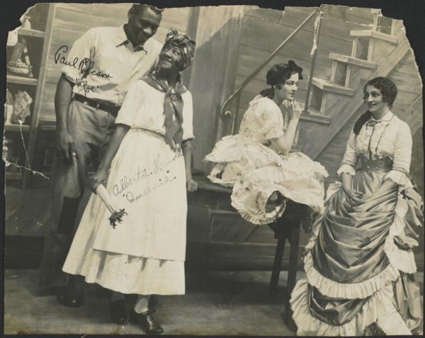 En effet, lorsque les charmantes jeunes filles du chœur classique prennent le relais, elles semblent bien ternes en comparaison. À la fin des années 1880, la division sociale entre les blancs et les noirs sur le Mississippi était naturelle… En conséquence, une distinction se retrouve aussi dans la distribution des rôles, puisque les artistes noirs, aussi distingués soient-ils, doivent nécessairement représenter des personnes de statut subalterne dans la pièce. Par exemple, cette admirable actrice, Miss Alberta Hunter, n’est rien de plus que la cuisinière Queenie du show boat; alors que même un acteur de la rare qualité de Paul Robeson ne doit pas être considéré comme l’égal des blancs, mais semble devoir se limiter à n’être rien de plus qu’un homme avec un manteau. C’est une belle ironie que Paul Robeson captive la salle dès sa première apparition et devient, à partir de ce moment, la personnalité dominante du spectacle.