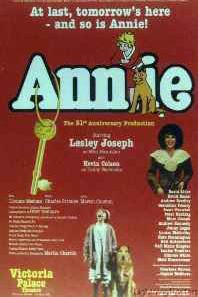 Dernière: 28 February 1999Mise en scène : Martin Charnin • Chorégraphie : Peter Gennaro • Producteur : Star(s) : Avec: Lesley Joseph (Miss Hannigan), Charlene Barton/Sophie McShera (Annie), Kevin Colson (Oliver Warbucks), Kate Normington (Grace Farrell). Andrew Kennedy (Rooster), Gail Marie Shapter (Lily), Matt Zimmerman (Bert Healy), Peter Harding (FDR)Commentaires : This was re-created by the same production team that staged the original London production in 1978 - twenty years earlier. Most critics welcomed it back, though one or two felt the intervening decades had taken the edge off the show. It ran for five months.Presse : ROBERT GORE-LANGTON of THE DAILY EXPRESS says, A vat of shameless syrup, I lapped it up. In the West End race for the big Christmas outing, Annie moves into poll position."