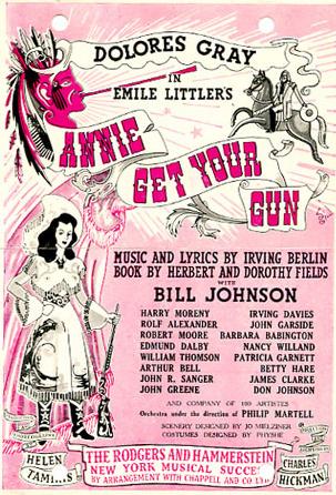 Dolores Gray a joué dans la production londonienne de 1947, faisant d'elle une star du jour au lendemain. Pendant qu'elle jouait Annie get your gun, elle a décidé d'étudier l'art dramatique à la Royal Academy of Dramatic Art. Signalons que le rôle avait été proposé à June Havoc qui l'avait refusé! Puis à Pat Kirkwood, qui n'a pas pu le jouer pour cause de dépression.