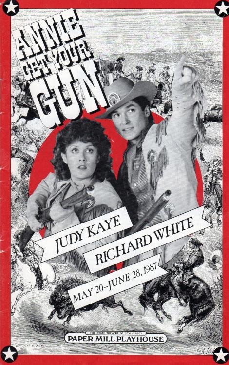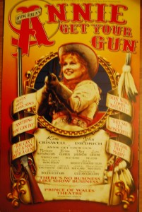 Dernière: 04 October 1986Mise en scène : David Gilmore • Chorégraphie : Anthony Van Laast • Producteur : Star(s) : Avec: Suzi Quatro (Annie Oakley), Eric Flynn (Frank Butler), Edmund Hockridge (Buffalo Bill), Berwick Kaler (Chief Sitting Bull), Matt Zimmerman (Charlie Davenport), Maureen Scott (Dolly Tate), John Conroy, Michael G. Jones, Tony PendrettiCommentaires : This Chichester Festival Theatre production was generally regarded as rather lacklustre, and although Suzi Quatro (billed as “America’s First Lady of Rock”) had an appealing personality, most critics felt she made insufficient impact as the gun-toting Annie Oakley. The original London production opened at the Coliseum on June 7th 1947 and ran for 1,304 performances, and made a star of Dolores Gray in the leading role. (The 1946 New York premiere was a huge success for Ethel Merman.)