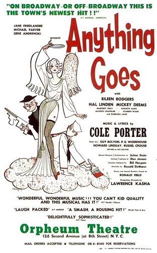 An Off-Broadway revival of Anything Goes opened on May 15, 1962 at the Orpheum Theatre. It starred Hal Linden as Billy Crocker and Eileen Rodgers as Reno Sweeney. The stage script was revised and incorporated several of the changes from the movie versions. The minor character named Erma was expanded and her name changed to Bonnie. This revival also added several songs from other Porter shows that came after the original production of Anything Goes. From the 1930 musical, The New Yorkers, came the song "Take Me Back to Manhattan," from the 1934 musical, Red Hot and Blue, came the song "It's De-Lovely," from the 1939 musical, DuBarry Was a Lady, came the song "Friendship," and from the 1929 musical, Paris, came the song "Let's Misbehave".