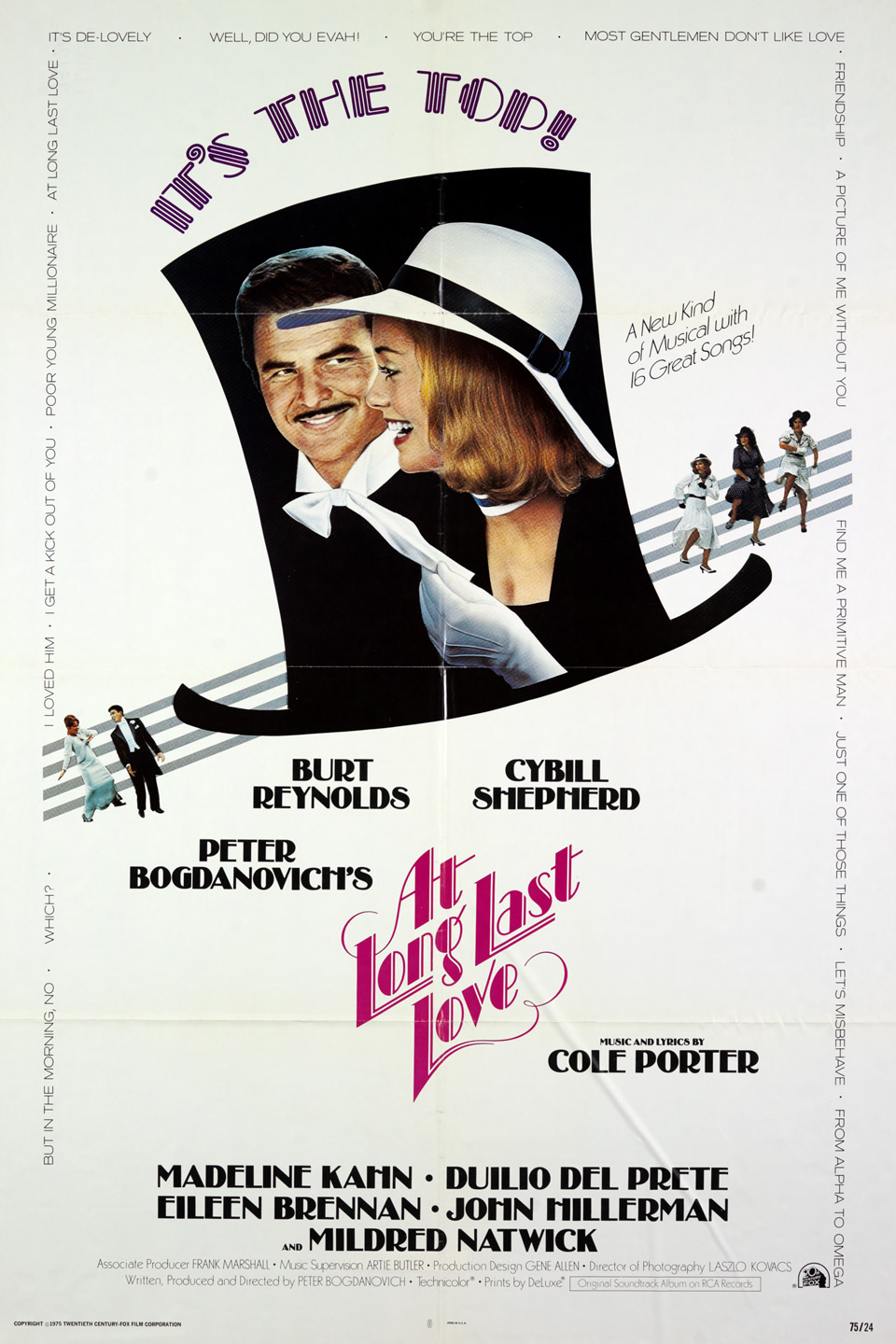 At Long Last Love is a 1975 American jukebox musical comedy film written, produced, and directed by Peter Bogdanovich. It stars Burt Reynolds, Cybill Shepherd, Madeline Kahn, and Duilio Del Prete as two couples who each switch partners during a party and attempt to make each other jealous. Featuring 18 songs with music and lyrics by Cole Porter, Bogdanovich was inspired to make a musical with the composer's songs after Shepherd gave him a book of his songs. All of the musical sequences were performed live by the cast, since At Long Last Love was meant by Bogdanovich to be a tribute to 1930s musical films like One Hour With You, The Love Parade, The Merry Widow and The Smiling Lieutenant that also filmed the songs in the same manner.