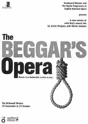 Dernière: 23 October 1999Mise en scène : Adrian Jackson • Chorégraphie : Producteur : Star(s) : Avec: Dele Adagunodo (Peachum), Mary King (Mrs Peachum), Victoria Ward (Polly Peachum), James Staddon (Macheath), Alexandra Howlett (Jenny Diver), Sophie Langham (Lucy Lockitt), Graham Kent (Lockitt)Commentaires : This was a joint production between the English National Opera’s outreach programme and Cardboard Citizens, Britain’s only professional theatre company for the homeless. The anticipation was a telling comment on how little had changed from the 18th century’s attitude to the poor and the ruling class. But the end result was felt to be a bit of a mess: the show was frequently interrupted with video-diary sound-bites from both fictional characters and today’s real homeless projected on a bank of TV monitors; the action was held up with some strange karaoke-type pop songs including “Love and Marriage”, “It’s Not Unusual”, “Thank Heaven for Little Girls” and even “Jealousy”, sung by Lucy Lockit strapped into a wheelchair. . . It was generally considered to be well-intentioned, but an experiment that had not quite come off.