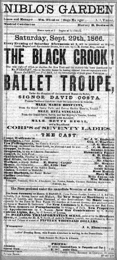 In the summer of 1866, lower Broadway was New York's busiest thoroughfare, just as congested with traffic as it is today, but with temperamental horses and piles of manure added to the chaos of carriages and people. As post-Civil War business boomed, there was a sharp increase in the city's working and middle class population, and these growing masses of people craved entertainment. Theaters abounded in Manhattan. One of the most popular venues was Niblo’s Garden, a 3,200 seat auditorium at the corner of Broadway and Prince Streets that boasted the most well equipped stage in the city. Its manager was William Wheatley, a sometime actor and man who would invent the big-time Broadway musical. Not that he intended to invent anything. He was just trying to keep his theater in business.