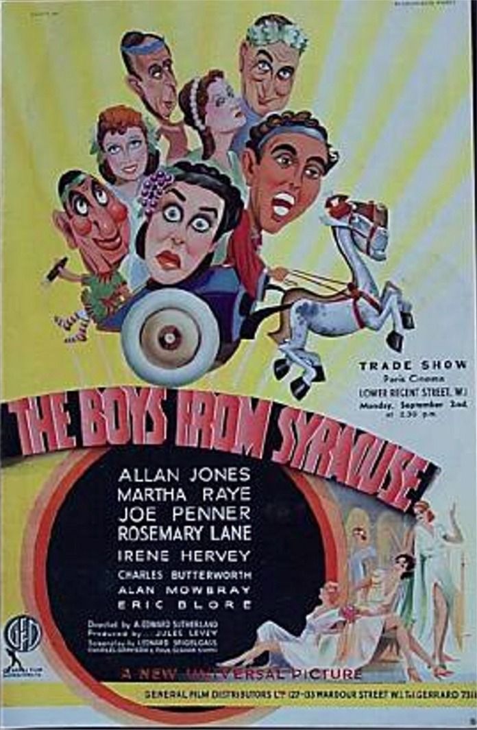 Dernière: 09 August 1940Mise en scène : A. Edward Sutherland • Chorégraphie : Producteur : Star(s) : Avec: Allan Jones (Antipholus of Ephesus and Antipholus of Syracuse); Irene Hervey (Adriana); Martha Raye (Luce); Joe Penner (Dromio of Ephesus and Dromio of Syracuse); Alan Mowbray (Angelo); Charles Butterworth (Duke of Ephesus); Rosemary Lane (Phyllis); Samuel S. Hinds (Angeen); Tom Dugan (Octavius); Spencer Charters (Turnkey); Doris Lloyd (Woman); Larry J. Blake (Announcer); Eddie Acuff (Taxi Cab Driver); Matt McHugh (Bartender); David Oliver (Messenger); Bess Flowers (Woman); Cyril Ring (Guard); Julie Carter (Girl); Eric Blore (Pinch); William Desmond (Citizen (uncredited))Presse : "Considering that it was adapted from a Broadway musical by Richard Rodgers, Lorenz Hart and George Abbott, The Boys From Syracuse must rank as a disappointment, though it manages to remain entertaining throughout its surprisingly brief 74-minute running time. Like its theatrical predecessor, the film was inspired by Shakespeare's The Comedy Of Errors ("After a play by William Shakespeare long, long after" reads the opening title). In ancient Ephesus, young tyrant Antipholus (Allan Jones) sentences elderly merchant Aegeon (Samuel S. Hinds) to death unless the latter can come up with a handsome ransom. What Antipholus doesn't know is that Aegeon is his own father; he also doesn't know that he has a twin brother, also named Antipholus (and also played by Allan Jones) who has just arrived from Syracuse in search of dear old daddy. Further complicating matters is that Antipholus of Ephesus and Antipholus of Syracuse both have slaves named Dromio (Joe Penner)-likewise identical twins! The mistaken-identity angle is played to the hilt, with A. of E.'s wife Adriana (Irene Hervey), A. of S.'s girlfirend Phyllis (Rosemary Lane), and Dromio of Ephesus' main squeeze Luce (Martha Raye) ending up just as confused as everyone else. Only four of the original Rodgers & Hart songs were retained-"This Can't Be Love", "Falling In Love With Love", "Sing For Your Supper", and "Oh, Diogenes"-while two new ones were written for the film. Most of the best jokes are based on anachronisms, with Dromio the slave organizing a labor union (complete with placards), a cheering section at an execution shouting "Give him the ax", and a parchment newspaper bearing such headlines as "Ephesus Blitzkriegs Syracuse". Originally purchased by Universal as a vehicle for the Ritz Brothers, The Boys from Syracuse isn't any great shakes, but it would certainly be well worth seeing again (last telecast in the 1970s, it seems to have fallen off the face of the earth in recent years!)" Hal Erickson