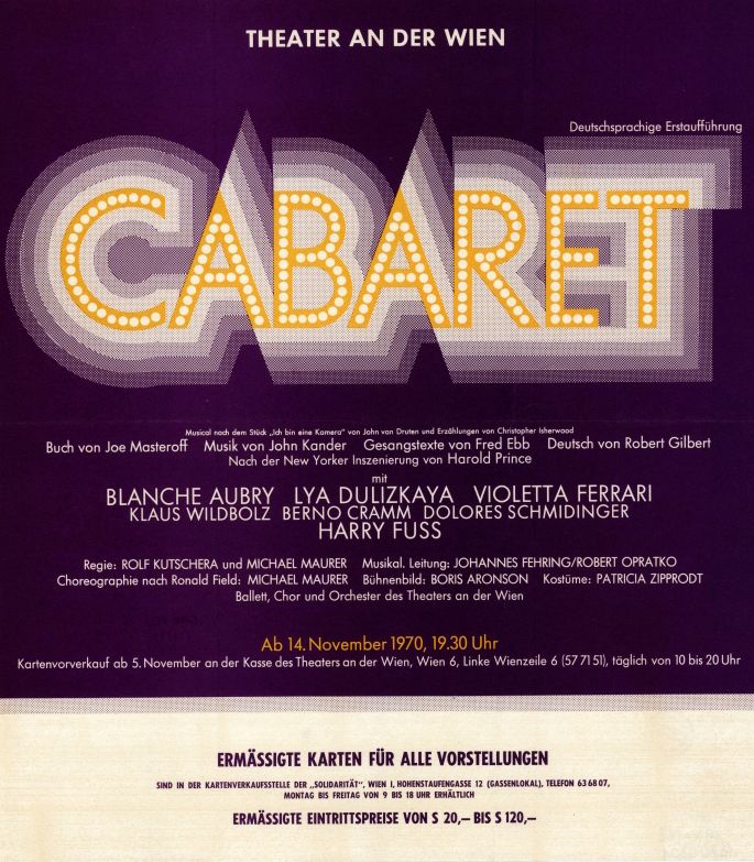 CABARET est un musical d'abord mis en scène à Broadway en 1966 par Harold Prince, dont le livret fut créé par Joe Masteroff, la musique par John Kander et les paroles par Fred Ebb. Ce spectacle était inspiré des nouvelles de Christopher Isherwood regroupées dans « Adieu à Berlin », dont les thèmes furent repris dans la pièce de Broadway « I Am a Camera », de l'auteur John van Druten (1951).