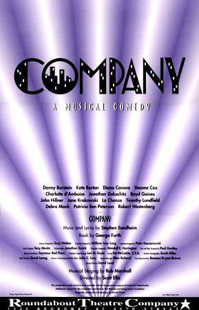 Revived by the Roundabout Theatre Company, COMPANY opened again on Broadway at the Criterion Center Stage Right on October 5, 1995 . Directed by Scott Ellis and choreographed by Rob Marshall, the revival cast included Boyd Gaines, Kate Burton, Robert Westenberg, Diana Canova, Debra Monk, LaChanze, Charlotte d'Amboise, Jane Krakowski, Danny Burstein and Veanne Cox.