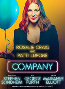Dernière: 30 March 2019Mise en scène : Marianne Elliott • Chorégraphie : Producteur : Star(s) : Patti LuPone • Avec: Rosalie Craig (Bobbie), Patti LuPone (Joanne)Commentaires : Frequently billed as 'the first concept musical' Company follows Bobby a single man unable to commit fully to a steady relationship or marriage. The show begins on his 35th birthday where we see his interactions with his best friends, five married couples and three girlfriends. The musical explores his relationships through a series of short vignettes, breaking the traditional mould of a book musical. The show was successful as it represented adult themes and reflected back the lives of New Yorkers in a way that hadn't previously been seen in commercial musical theatre.