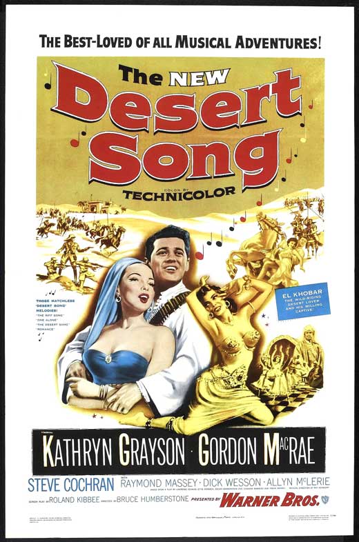 Dernière: InconnuMise en scène : H. Bruce Humberstone • Chorégraphie : Producteur : Star(s) : Avec: Kathryn Grayson (Margot), Gordon MacRae (El Khobar/Paul Bonnard, the dashing outlaw leader), Steve Cochran (Captain Claud Fontaine, El Khobar's rival for Margot's affections), Raymond Massey (Sheik Youseff, the villain), Dick Wesson (Benjamin 'Benjy' Kidd), Allyn McLerie (Azuri), Ray Collins (General Birabeau, here depicted (Margot's father, rather than the hero's), Paul Picerni (Hassan), Frank DeKova (Mindar), William Conrad (Lachmed), Trevor Bardette (Neri), Mark Dana (Lt. Duvalle)Commentaires : Il s’agit de la troisième version cinématographique du musical, la troisième réalisée par Warner Bros., et la deuxième en trois bandes Technicolor. Bien qu’il ait été commercialisé en 1953, il n’a pas été réalisé en écran large.