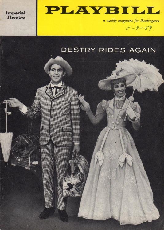 The show opened on Broadway at the Imperial Theatre on February 23, 1959 and closed on June 18, 1960 after 472 performances. Michael Kidd was the director and choreograper. The cast starred Andy Griffith as Destry and Dolores Gray as Frenchy.