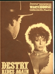 Dernière: InconnuMise en scène : Robert Walker • Chorégraphie : Stuart Hopps • Producteur : Star(s) : Avec: Alfred Molina (Destry), Jill Gascoigne (Frenchy), Nicola Blackman (Clara), Julian LittmanCommentaires : Based on the story by Max Brand, this began life as a Hollywood film (in fact filmed three times) most notably with Marlene Dietrich as Frenchy.
