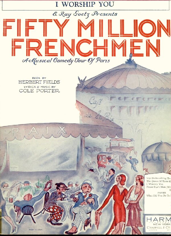 Fifty Million Frenchmen de Cole Porter a été qualifiée de «Musical Comedy Tour of Paris», et le tract pour le Try-Out de Washington tentait de séduire le public avec la promesse d’un «tour de luxe». Oui, pour le prix d’un «siège réservé», un spectateur pourrait «se promener dans les bois dans une barouche ouverte (calèche), visiter des champs de bataille, boire des cocktails au champagne au bar du célèbre Ritz, manger de la pâtisserie française chez Rumpelmeyer ou faire des galipettes au Moulin Rouge». Cet itinéraire imaginatif et provocateur comprenait également «La Tombe de Napoléon, la Madeleine, les cartes postales osées du Café de la Paix, les douairiers dansant avec les gigolos, les Citroën de Montmartre, les cocottes françaises, le Harry’s American Bar, la Place Vendôme, le Château Madrid et enfin le cher American Express». Ainsi, pour le prix d’un billet de théâtre (la place la plus chère pour la production de Broadway vendue pour 5,50$), le spectateur pouvait faire tout ce voyage accompagné par la musique de Cole Porter qui contenait de sublimes sérénades ( You Do Something to Me ) ou des demandes impertinentes ( Where Would You Get Your Coat?). Cole Porter avait été un peu joué à Broadway, mais c’est le spectacle qui l’a mis en pleine lumière. Il s’est joué pour 254 performances, a offert un trésor de chansons mémorables, et a finalement été filmé deux fois.