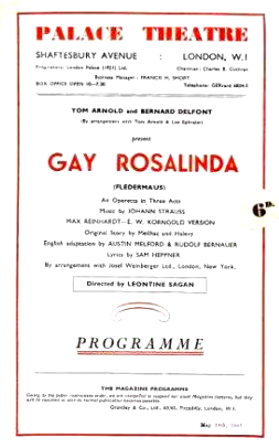 In 1942 the famous German director, Max Reinhardt, staged a revival on Broadway under the title “Rosalinda”, and this was a triumph, running for 502 performances. This version, with musical arrangements by Erich Korngold was adapted for London by Austin Melford and Rudolf Bemauer - and was a great success, running for a year, closing on March 2nd 1946.