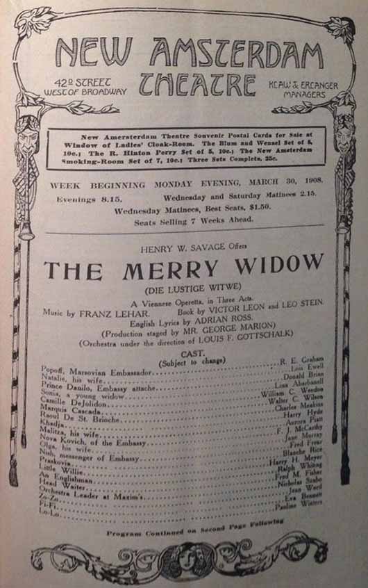 Dernière: 17 October 1908Mise en scène : George Marion • Chorégraphie : Producteur : Henry W. Savage • Star(s) : Avec: Donald Brian (Prince Danilo), Lois Ewell (Natalie), R. E. Graham (Popoff), Ethel Jackson (Sonia, The Merry Widow), M. AlbertiMarion Armstrong (Jou-Jou), M. Bauer (Marsovian Dancing Man), Portia Belma (Margot), Eva Bennett (Fi-Fi), M. Boone (Marsovian Dancing Man), Frances Cameron (Olga, Zo-ZO), M. Cassidy (Guest), Miss Corwin (Guest), Miss Creagh (Guest), Margaret Dalrymple (Malitza), Miss Davees (Guest), Emil Demetorad (Marsovian Troubadour), M. Doyle (Servant), Miss Duryea (Guest), M. Ellinger (Marsovian Dancing Man), M. Fisher (Marsovian Dancing Man), Fred Frear (Nisch), M. Hamilton (Servant), Bernice Harte (Zu-Zu), M. Hastings (Guest), M. Holt (Guest), Alekx Hursau (Marsovian Troubadour), Harry Hyde (Khadja), Koszta Kolarszky (Marsovian Troubadour), M. Lane (Guest), Gerald Lane (Head Waiter), M. Livington (Guest), Cira Lozarne (Marsovian Troubadour), M. Manchester (Marsovian Dancing Man), Walda Marjanovich (Marsovian Troubadour), F.J. McCarthy (Nova Kovich), Charles Meakins (Raoul de St. Brioche), M. Meyer (Guest), Harry H. Meyer (Little Willie), M. Miller (Servant), Miss Murray (Guest), Aurora Piatt (Lo-Lo), M. Ransome (Marsovian Dancing Man), Blanche Rice (Praskovia), Miss Schiebly (Guest), Mr. Smith (Guest), Nicholas Szabo (Orchestra Leader at Maxim's; Marsovian Troubadour), M. Taylor (Marsovian Dancing Man), Clara Tichenor (Clo-Clo), M. Von Calish (Marsovian Dancing Man), Miss Wadham (Guest), Jean Ward (Frou-Frou), William C. Weedon (Camille de Jolidon), M. Whiting (Guest), Ralph Whiting (Englishman), Walter C. Wilson (Marquis Cascada), Pauline Winters (Do-Do), Miss Witt (Guest), Sophie Witt (Sapho)Commentaires : New Amsterdam Theatre (21 Oct 1907 - 28 Juin 1908)