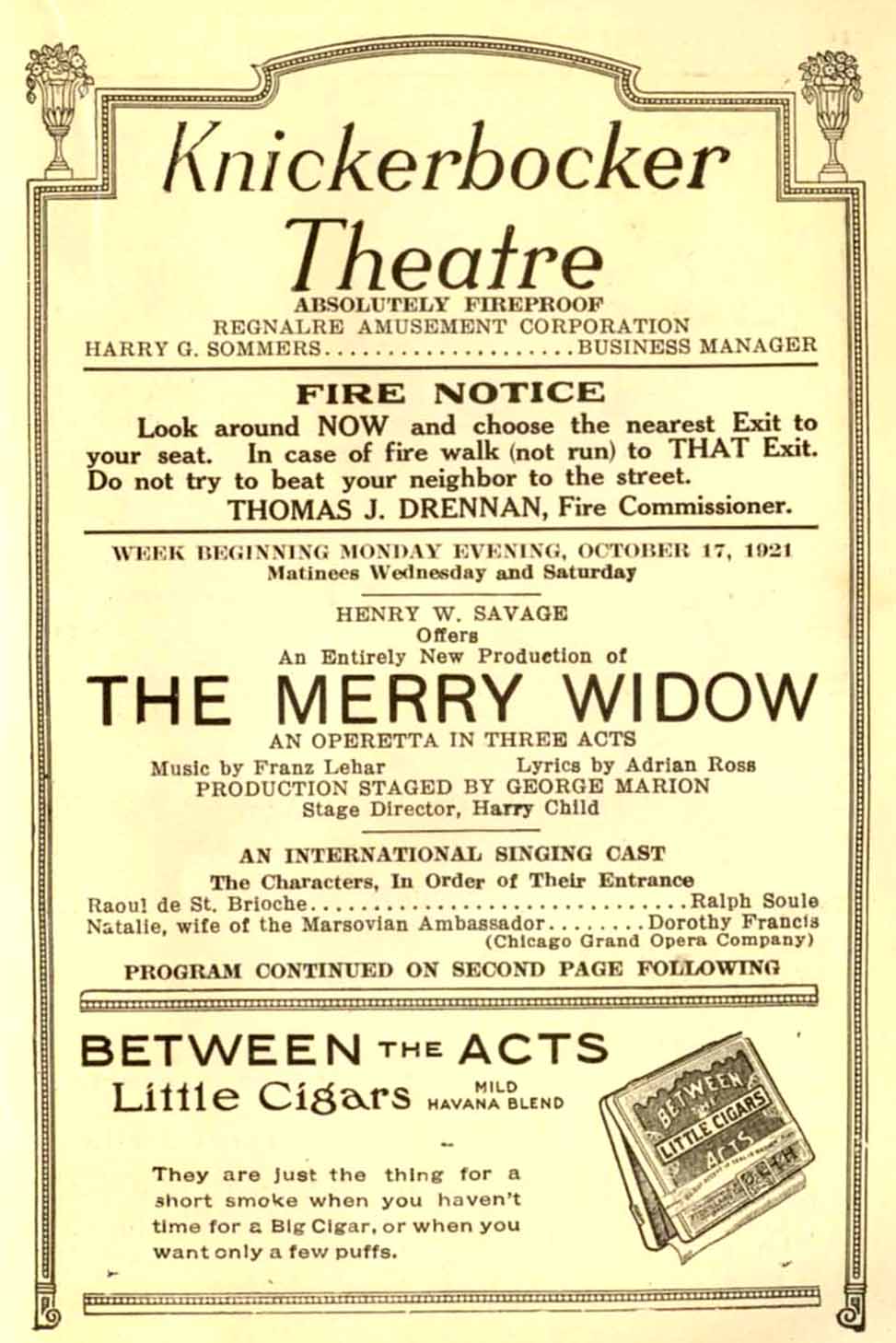 Dernière: 22 October 1921Mise en scène : George Marion • Chorégraphie : Producteur : Star(s) : Avec: Charles Angelo (Khadja), Peggy Arthur (Fi-Fi), Albert Barber (Chorus), Elsie Bartlett (Chorus), Warren BassetteDora Beck (Chorus), Albert Bennett (Chorus), Blossom Churan (Chorus), John Clark (Chorus), John Colvin (Chorus), Raymond Crane (Popoff), Celeste Craven (Chorus), Jefferson De Angelis (Nish), Evelyn Dorn (Do-Do), Yvette DuBois (Zo-Zo), Georges Dufranne (Marquis Cascada), Bert V. Elias (Orchestra Leader at Maxim's), Jean Ferguson (Chorus), Dorothy Francis (Natalie), Dorothy Gilbert (Jou-Jou), Arthur Goodrich (Chorus), Herbert Heming (Chorus), Weslyn Hull (Little Willie), Charles Huston (Chorus), Joseph Huzar (Chorus), James Kovachevich (Chorus), Lydia Lipkowska (Sonia, The Merry Widow), Kathleen Mayer (Chorus), Ad Meyer (Chorus), Horace Milleron (Chorus), Esther Morris (Margot), Harry Parry (Chorus), Reginald Pasch (Prince Danilo), Patrick Quinton (Chorus), Robert Roberts (Chorus), Frances Romana (Clo-Clo), Louise Rostrand (Chorus), Margaret Schilling (Melitza), Blanche Seymour (Praskovia), Edward Sheldon (Chorus), Horace R. Sisson (Chorus), James Smith (Chorus), Rosco Snyder (Chorus), Ralph Soule (Raoul de St. Brioche), Gwyn Stratford (Lo-Lo), Jeanne Stuart (Chorus), Blaz Tkalae (Chorus), Micha Vranasevich (Chorus), Margery Wall (Frou-Frou), Frank Webster (Camille de Jolidon), Marie Wells (Olga), William H. White (General Novikovich), John Yorke (Head Waiter)