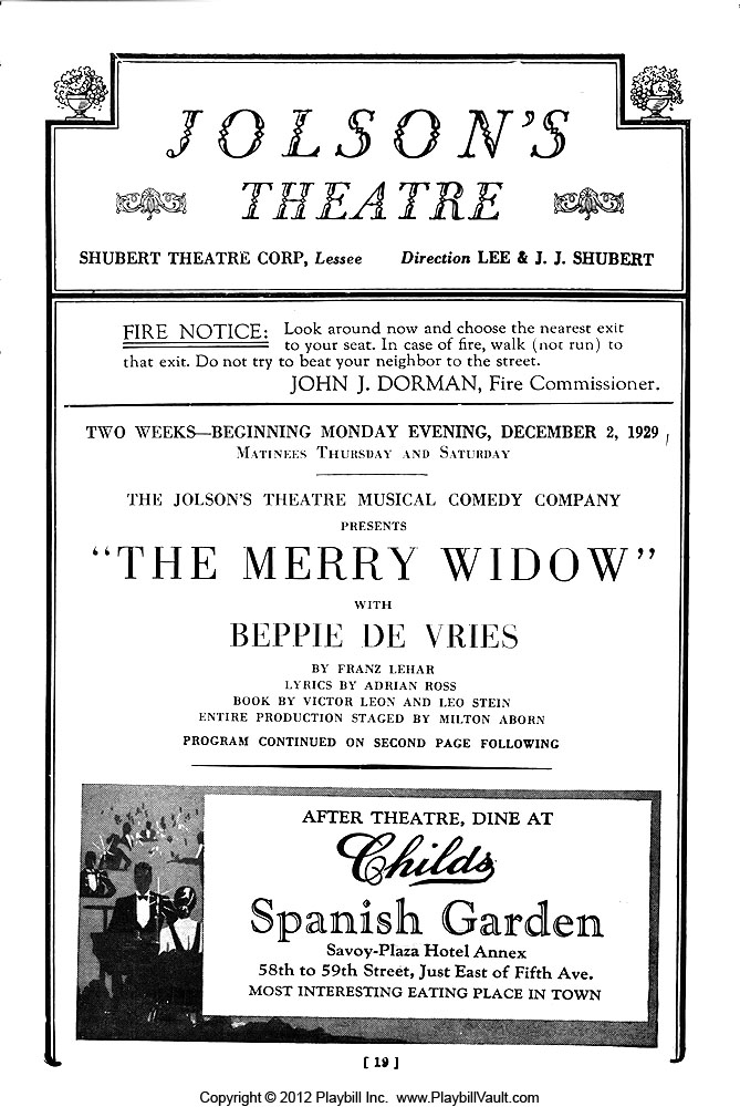 Dernière: 14 December 1929Mise en scène : Milton Aborn • Chorégraphie : Producteur : Star(s) : Avec: Amy Alexander (Do-Do), Frances Bariello (Jou-Jou), Lizette Braddock (Fi-Fi), Paul Catlin (Raoul de St. Brioche), Roy CropperBeppe De Vries (Sonia, The Merry Widow), Dene Dickens (Natalie), Helen Etheridge (Clo-Clo), Eleanor Gilmore (Frou-Frou), Wee Griffin (Lo-Lo), Clarence Harvey (Khadja), Ethel Lynn (Zo-Zo), W.J. McCarthy (Nish), Leslie McLeod (Head Waiter), Mary Patterson (Olga), William Phite (General Novikovich), Richard Powell (Popoff), Bernie Sager (Little Willie), Evan Thomas (Prince Danilo), Mary Thurman (Margot), Francesco Yannelli (Marquis Cascada)