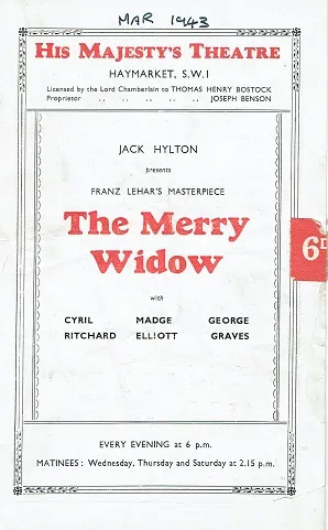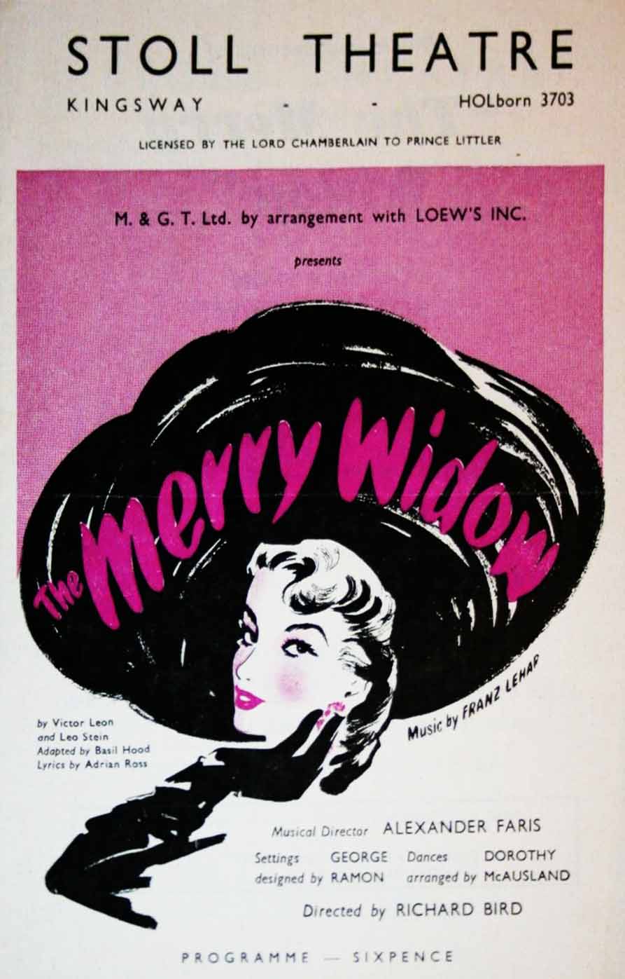 Dernière: June 1952Mise en scène : Richard Bird • Chorégraphie : Producteur : Star(s) : Avec: Helen Gilliland (Sonia), Carl Brisson (Danilo), Nancie Lovat (Natalie), George Graves (Popoff) , Derek Oldham (Vicomte Camille), George Child (Marquis)Commentaires : Ce fut l’un des plus grands succès mondiaux dans l’histoire du théâtre musical - sans précédent jusqu’au succès phénoménal des spectacles de Lloyd Webber/Cameron Mackintosh dans le dernier quart du 20e siècle. Il a été créé à Vienne en 1905 et a fait son chemin autour du monde, battant des records de box-office partout et menant à certains merchandising et modes de mode – chapeaux de veuve joyeux, éventails, robes et même corsets! La première production à Londres date de 1907.