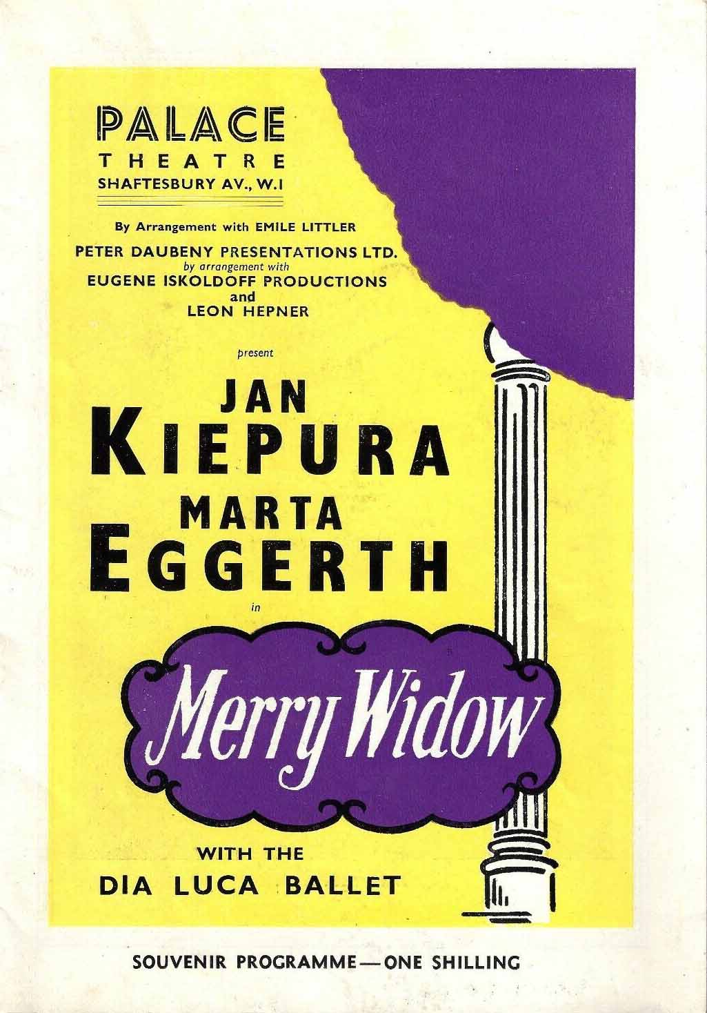 Dernière: June 1955Mise en scène : Chorégraphie : Producteur : Star(s) : Avec: Marta Eggerth (Hanna Glawari), Jan Kiepura (Count Danilo), Fritz Diestel (Baron Zeta), Franzi Wachmann (Valencienne)Commentaires : Marta Eggerth et Jan Kiepura étaient mari et femme – elle était hongroise et il était polonais – et ils étaient très populaire dans le monde de l’opéra, des salles de concert et de cinéma. Ils étaient très aimés dans toute l’Europe, aux Etats-Unis et au Canada et étaient particulièrement pour « The Merry Widow ». Ils l’ont joué plus de 200 fois dans quatre langues différentes – l’anglais, le français, l'allemand et l'italien. Cette série londonienne limitée au Palace Theatre faisait partie d’une tournée européenne.