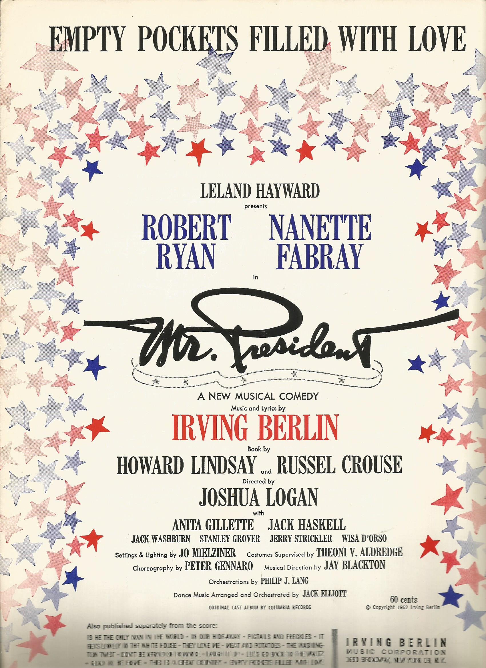 After four previews, the Broadway production, directed by Joshua Logan and choreographed by Peter Gennaro, opened on October 20, 1962 at the St. James Theatre, where it ran for 265 performances. The cast included Robert Ryan, Nanette Fabray, Anita Gillette and Baayork Lee. The musical premiered in a Broadway season dominated by hits like Oliver!, A Funny Thing Happened on the Way to the Forum and Stop the World – I Want to Get Off. Mr. President received unenthusiastic reviews. Although Berlin's score was praised, the show "was just too old-fashioned and out of date." Berlin continued to work, revising Annie Get Your Gun and writing songs, such as for the film project Say It With Music (which was never produced), but "Broadway would never again see a truly Berlin work on the stage". Mr. President was the final Lindsay and Crouse collaboration.