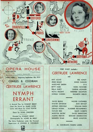 Cole Porter’s Nymph Errant opened at the Manchester Opera House in 1933 and the crowds were so huge that special police had to be drafted in to control them. The audience included Noël Coward and Douglas Fairbanks Jnr, with whom Gertrude Lawrence was having an affair at the time. The show, based on a book by James Laver, a curator at the Victoria & Albert Museum, traced the heroine’s travels around the world while trying to lose her virginity. Gertie appeared in four of the shows six long scenes and closed the show exhorting everyone to ‘Experiment’ with life. Perhaps because the episodic nature of the plot made it more of a revue than a musical, reviews of the show were cautious. But no one had any doubts about Lawrence’s performance or that of Elisabeth Welch, who stopped the show with her rendering of Solomon. Their captivating performances can still be heard on recordings made at the time.