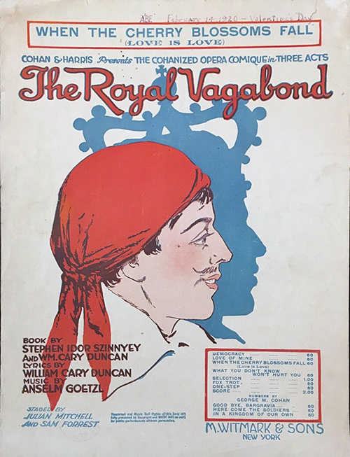 Cohan and Harris: 8 sept 1919 - 3 janv 1920Presse : "The real humor of "The Royal Vagabond", lies in the fact that its original absurd sentimentality is kept in constant view. Mr. Cohan did not make the mistake of obliterating the victim whom he set out to hold up to ridicule. A good share of the melodious score by Dr. Anselm Goetzl he retained. The threat of the mildewed plot by William Cary Duncan and Stephen Ivor-Szinney he carefully preserved. But by the irreverent process of contrasting the first with his own up-to-date syncopated numbers and puncturing the second with sophisticated comedy he evolved something that is in effect a fresh and novel style of musical comedy fun." Louis DeFoe - New York World