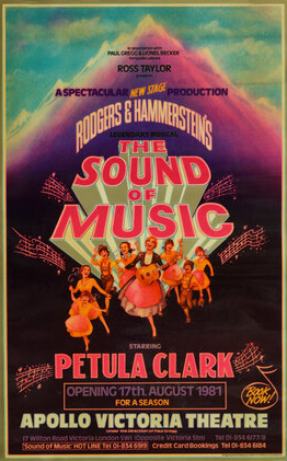 Dernière: 18 September 1982Mise en scène : John Fearnley • Chorégraphie : Ronald Hynd • Producteur : Star(s) : Avec: Petula Clark (Maria), Michael Jayston (Captain von Trapp), Honor Blackman (Elsa), John Bennett (Max Detweiler), June Bronhill (Mother Abbess), Paul Shearstone (Rolf), Patricia Conti (Sister Margaret)Commentaires : In 1981, at producer Ross Taylor's urging, Petula Clark agreed to star in a revival of the show at the Apollo Victoria Theatre in London's West End. Michael Jayston played Captain von Trapp, Honor Blackman was the Baroness and June Bronhill the Mother Abess. Despite Clark's misgivings that, at age 49, she was too old to play the role convincingly, Clark opened to unanimous rave reviews (and the largest advance sale in the history of British theatre at that time). Maria von Trapp herself, present at the opening night performance, described Clark as "the best" Maria ever. Clark extended her initial six-month contract to thirteen months. Playing to 101 percent of seating capacity, the show set the highest attendance figure for a single week (October 26–31, 1981) of any British musical production in history (as recorded in The Guinness Book of Theatre).