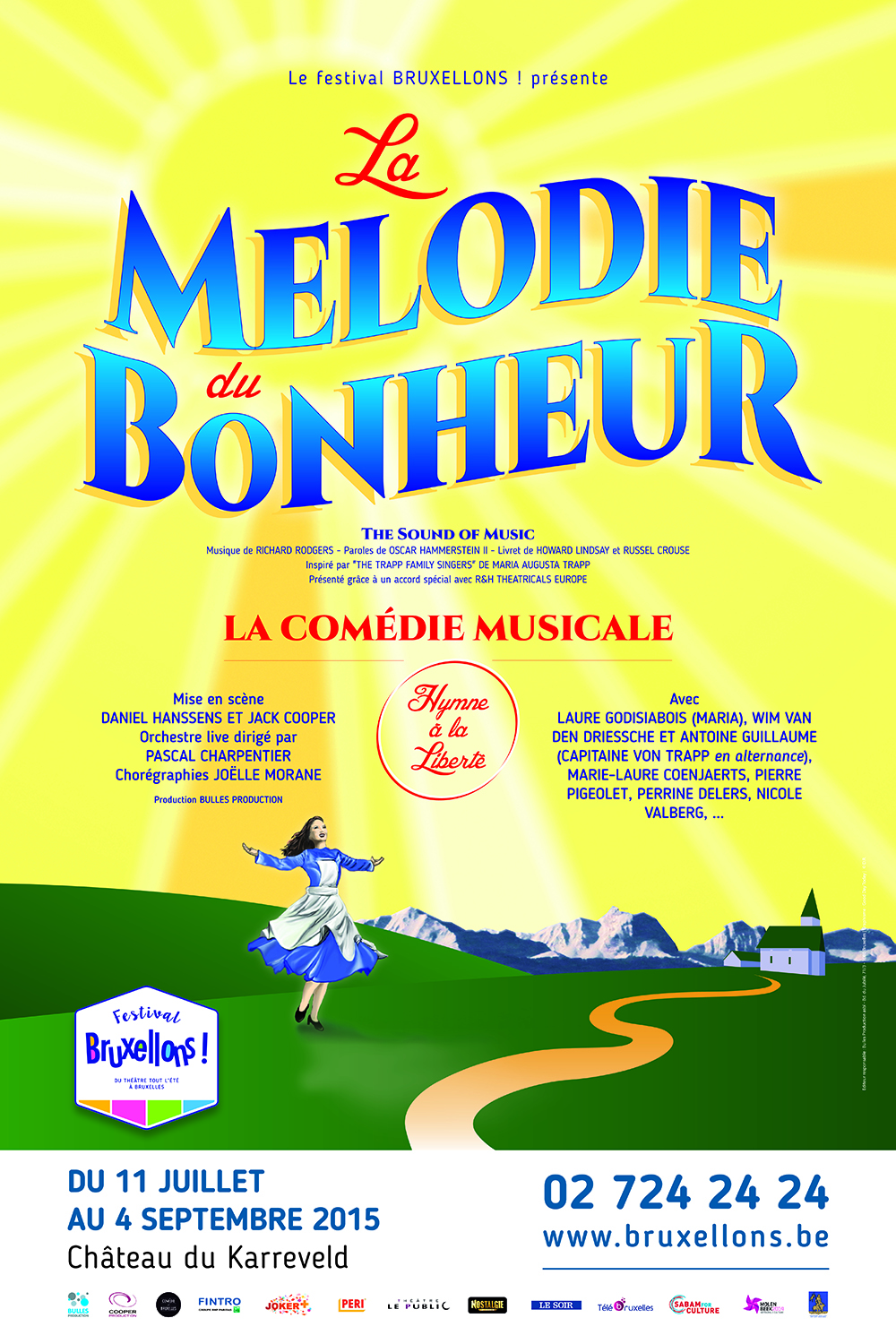 Dernière: 08 September 2015Mise en scène : Daniel Hanssens • Jack Cooper • Chorégraphie : Producteur : Star(s) : Avec: Laure Godisiabois (Maria), Wim van den Driessche (Capitaine von Trapp), Marie-Laure Coenjaerts (La Mère Supérieure), Pierre Pigeolet (Max Detweiler), Perrine Delers (Baronne Elsa Schraeder), Nicole Valberg (Mme Schmidt, la gouvernante), Roland Bekkers (Franz, le majordome), Damien Locqueneux (Rolf Grüber), Maud Hanssens (Liesl von Trapp), Estaban Brouillard (Friedrich von Trapp), Clara Barlow (Louisa von Trapp), Nicolas Djuroski (Kurt von Trapp (en alternance)), Sylvain Schmitt (Kurt von Trapp (en alternance)), Joëlle Massart (Brigitta von Trapp (en alternance)), Adélaïde Couplet (Brigitta von Trapp (en alternance)), Clémentine Guyot (Marta von Trapp (en alternance)), Noéline Siméons (Marta von Trapp (en alternance)), Ivy Barlow (Gretl von Trapp (en alternance)), Camille Barreira (Gretl von Trapp (en alternance)), Shérine Seyad (Sœur Margaretta), Sarah Delforge (Sœur Sophie), Jolijn Antonissen (Sœur Berthe), Marcel Bergez (Amiral von Schreiber), Jean-Claude Gerard (Baron Elberfeld), Anne Vrielinck (Baronne Eberfeld), Bruno Mullenaerts (Herr Zeller), Emilie Debu (Ensemble), Alice Lopez (Ensemble), Aline Massinon (Ensemble), Catherine Gallez (Ensemble), Mehdi Loumrhari (Ensemble), Raphaël Bocken (Ensemble), Stéphane Rimbert (Ensemble), Arnaud Delforge (Ensemble), Vincent David (Ensemble)