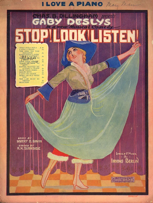 Stop! Look! Listen! d’Irving Berlin, une œuvre à la frontière entre musical et revue, s’est joué pendant trois mois et a créé une de ses chansons classiques, l’irrésistible « I Love a Piano », qui a été chanté par Harry Fox.