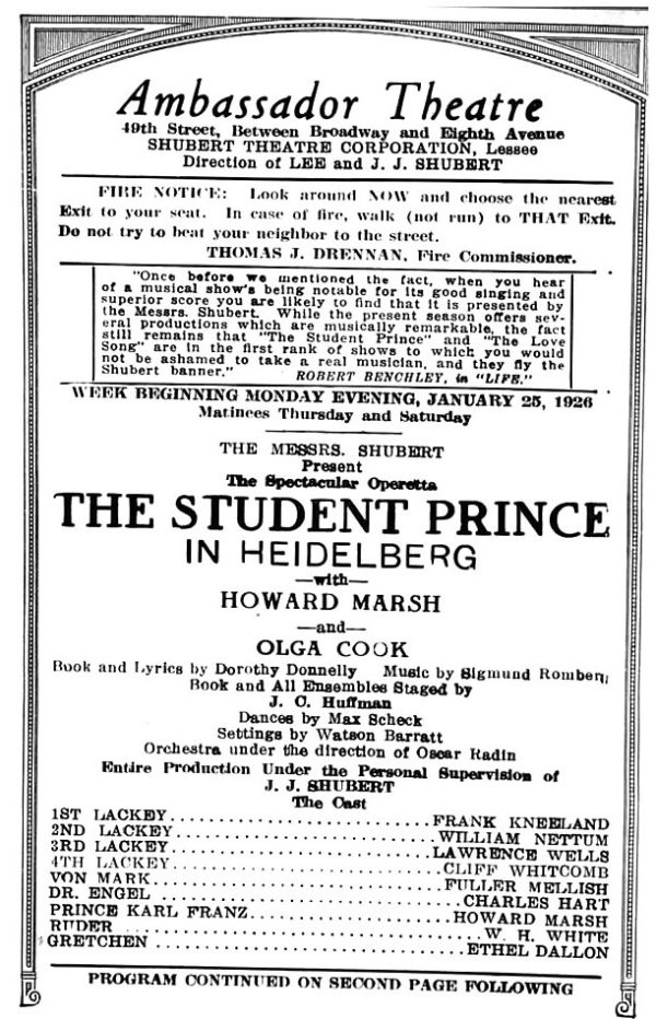 Dernière: 22 May 1926Mise en scène : Chorégraphie : Producteur : Star(s) : Avec: Harry Anderson (Fourth Lackey), Roberta Beatty (Princess Margaret, fiancee of Prince Karl Franz), Robert Calley (Baron Arnheim), Violet Carlson (Gretchen, Maid at the Inn), John CoastGreek Evans (Dr. Engel, the Prince's Tutor), George Hassell (Lutz, valet to the Prince), Paul Kleeman (Von Asterberg, another student leader), Frank Kneeland (First Lackey), Adolph Link (Toni, a waiter), Raymond Marlowe (Detlef, a student leader), Howard Marsh (Prince Karl Franz), Ilse Marvenga (Kathie, niece of Ruder), Martha Mason (Premier Dancer), Fuller Mellish (Von Mark), Lucius Metz (Rudolph), Florence Morrison (Grand Duchess Anastasia), William Nettum (Second Lackey), Dagmar Oakland (Countess Leyden, lady-in-waiting to the Princess), Elmer Pichler (Freshman), Conrad Sparin (Captain of the Guard), Lawrence Wells (Third Lackey), W. H. White (Ruder, Landlord of Inn of Three Gold Apples), Charles Williams (Hubert, the valet's valet), Fred Wilson (Nicolas), Frederic Wolff (Lucas, another student leader)Commentaires : Jolson's 59th Street Theatre: 2 Déc 1924 - 26 Déc 1925