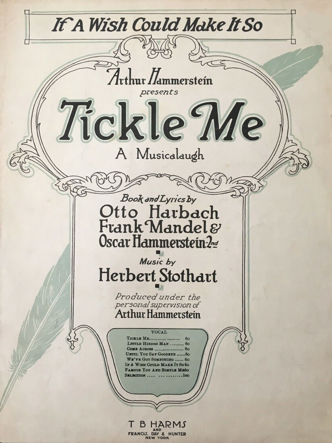 Tickle Me est un musical en deux actes avec un livret et des paroles d'Oscar Hammerstein II, Otto Harbach et Frank Mandel et une partition d'Herbert Stothart. Tickle Me a été produit par Arthur Hammerstein et a ouvert au Selwyn Theatre le 17 août 1920 et fermé après 207 représentations le 12 février 1921. Le musical s'est ensuite lancé dans un US Tour réussi jusqu'au printemps 1922.