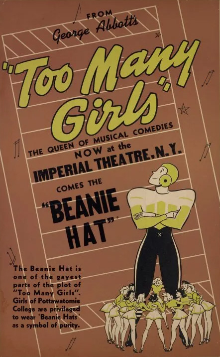 Richard Rodgers et Lorenz Hart s’amusent avec Too Many Girls, un musical à l’ancienne avec un livret de George Marion Jr., et une mise en scène de George Abbott. L’histoire familière était parsemée de moments comiques, de personnages colorés, d’une partition animée et des personnages principaux attachants, et le cadre de l’université a fait penser au succès de Good News () (1927) et l’intrigue était un peu une réminiscence de Girl Crazy ().